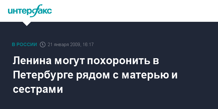 Санкт-Петербург. 21 января. INTERFAX.RU - В Музее городской скульптуры Петербурга, в ведении которого находится некрополь "Литераторские мостки" Волковского кладбища, не видят препятствий для захоронения тела Владимира Ленина, если такое решение примет руководство страны.