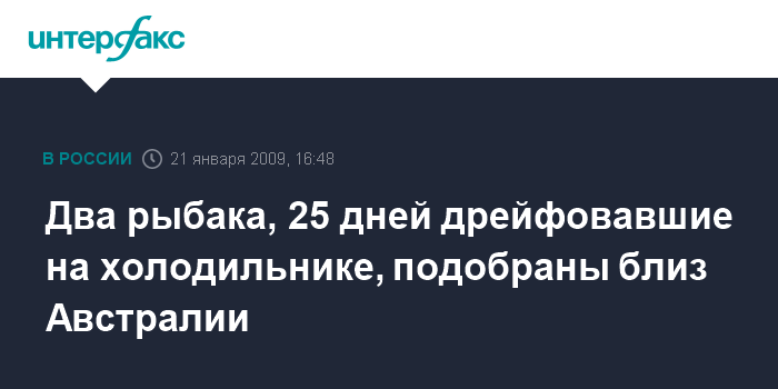 Лондон. 21 января. INTERFAX.RU - Два бирманских рыбака найдены дрейфующими в холодильнике в кишащих акулами водах Австралии спустя 25 дней после того, как затонуло их судно, говорится в сообщении, размещенном на вэб-сайте британской газеты Independent в среду.