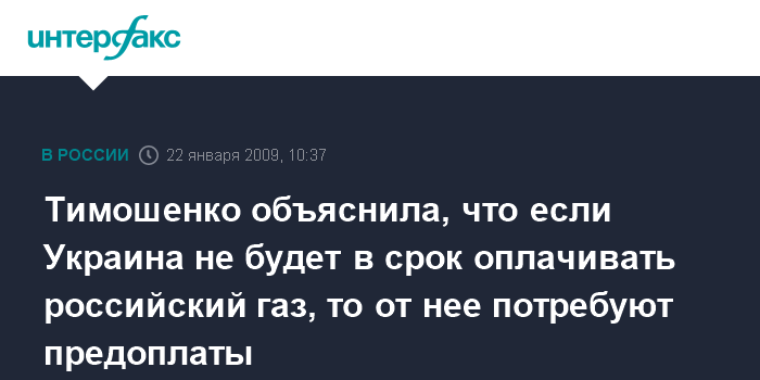 Москва. 22 января. INTERFAX.RU - Если Украина не будет платить за поставки российского газа в 2009 году вовремя, то ей будет выдвинуто требование предоплаты газа, заявила премьер-министр Юлия Тимошенко, комментируя в эфире телеканала "1+1" подписанные в Москве договоренности о поставках газа.