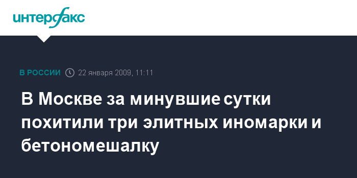 Москва. 22 января. INTERFAX.RU - В Москве за минувшие сутки были угнаны один Mercedes, два автомобиля Lexus и бетономешалка, сообщил "Интерфаксу" в четверг источник в правоохранительных органах.