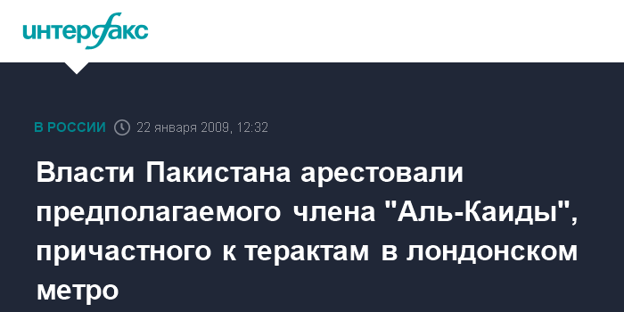 Москва. 22 января. INTERFAX.RU - Пакистанские власти арестовали предполагаемого члена террористической организации "Аль-Каида", причастного к терактам в лондонском метро в 2005 году, заявили власти страны.