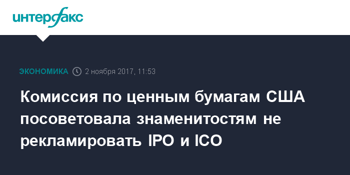 Москва. 2 ноября. INTERFAX.RU - Комиссия по ценным бумагам и биржам (SEC) США обеспокоена тем, что различные знаменитости все чаще высказываются в поддержку тех или иных сделок по размещению акций (IPO) или токенов (ICO) и могут тем самым вводить в заблуждение розничных инвесторов - обычных американцев без специальных знаний и навыков.