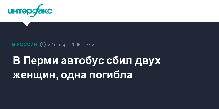 Пермь. 22 января. INTERFAX.RU - В Перми в четверг днем пассажирский автобус сбил двух женщин, перебегавших дорогу. Одна из них погибла на месте, сообщили агентству "Интерфакс" в пресс-службе ГИБДД Пермского края. Другую женщину после удара об автобус выбросило на полосу встречного движения, где на нее наехал легковой автомобиль. Женщина госпитализирована.