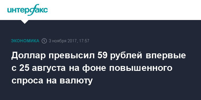 Москва. 3 ноября. INTERFAX.RU - Доллар США и евро активно растут на Московской бирже в пятницу вечером, при этом курс доллара превысил отметку 59 рублей впервые с 25 августа на фоне повышенного спроса со стороны участников рынка на валютную ликвидность.