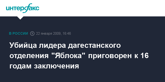 Москва. 22 января. INTERFAX.RU - Верховный суд Дагестана в четверг приговорил Расила Мамедризаева к 16 годам колонии строгого режима за убийство лидера регионального отделения партии "Яблоко" Фарида Бабаева, передал корреспондент агентства "Интерфакс-Юг".