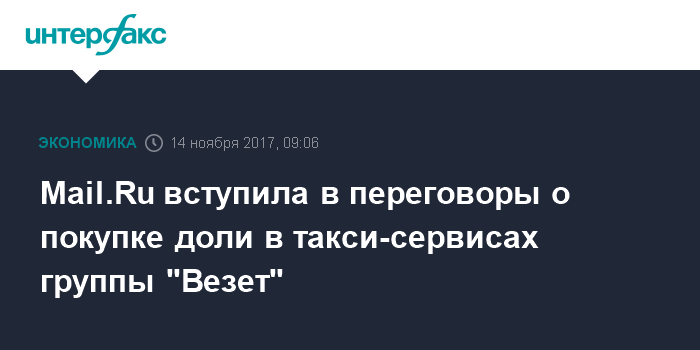 Москва. 14 ноября. INTERFAX.RU - Mail.Ru Group интересуется покупкой доли в группе компаний "Везет", управляющей такси-сервисами под брендами "Сатурн", RedTaxi, RuTaxi, "Лидер" и "Везет", сообщила газета РБК со ссылкой на источники, знакомые с ходом переговоров. В дальнейшем Mail.Ru Group заинтересована в доведении доли в группе до контрольной, знает один из собеседников издания.