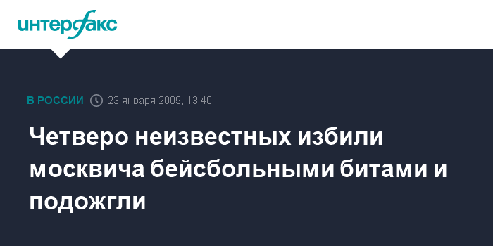 Москва. 23 января. INTERFAX.RU - В Москве четверо неизвестных напали на безработного, избили его бейсбольными битами, облили горючей жидкостью и подожгли, сообщил "Интерфаксу" источник в правоохранительных органах города в пятницу.