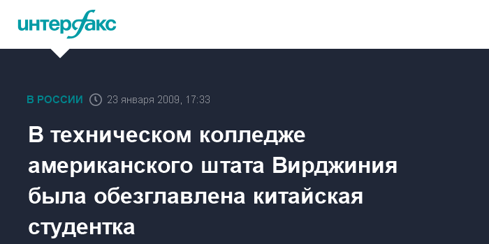 Москва. 23 января. INTERFAX.RU - Китайская студентка обезглавлена в техническом колледже американского штата Вирджиния, сообщает в пятницу британский телеканал Sky News.
