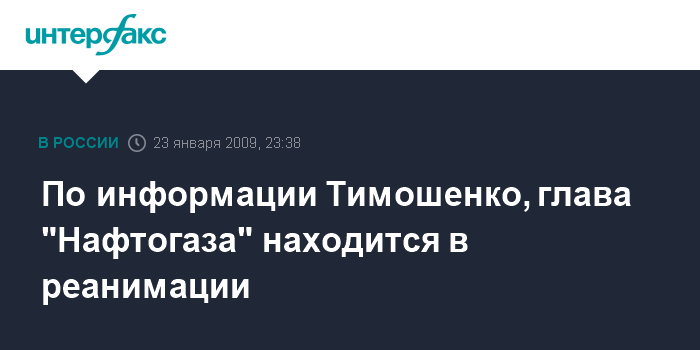 Киев. 23 января. ИНТЕРФАКС-УКРАИНА - Глава НАК "Нафтогаз Украины" Олег Дубина сейчас находится в реанимации, заявила премьер-министр Украины Юлия Тимошенко в эфире программы "Шустер Live" на телеканале "Украина" в пятницу вечером.