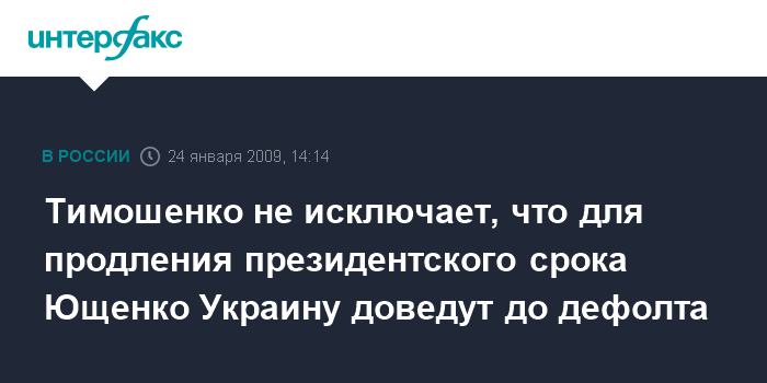 "Рассматривались разные варианты. Один из них - довести страну до дефолта, объявить чрезвычайное положение, которое Верховная Рада в такой ситуации будет вынуждена утвердить. Ну а по Конституции, как известно, во время чрезвычайного положения выборы в стране проводиться не могут", - сказала Ю.Тимошенко в интервью украинскому еженедельнику "Зеркало недели", опубликованном в субботу.