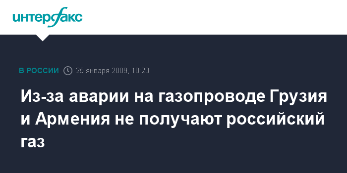 Тбилиси. 25 января. INTERFAX.RU - Поставка российского природного газа в Грузию и Армению была приостановлена минувшей ночью в связи с аварией, произошедшей на газоизмерительной станции магистрального газопровода "Гвелети" на грузинской территории.