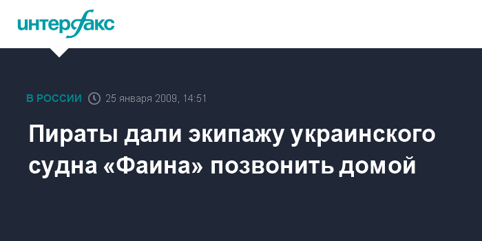 Москва. 25 января. INTERFAX.RU - Членам экипажа захваченного украинского судна "Фаина" пираты разрешили позвонить домой, сообщил главный редактор Интернет-издания "Морской бюллетень - Совфрахт" Михаил Войтенко.