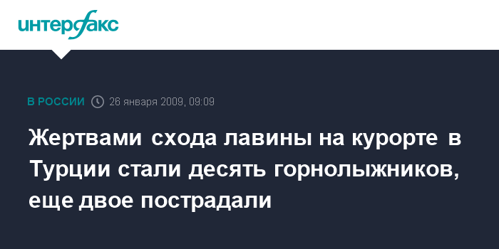 Москва. 26 января. INTERFAX.RU - В результате схода лавины на горнолыжном курорте Зигана на юго-востоке Турции погибли 10 человек, сообщает американский телеканал Си-Эн-Эн со ссылкой на представителей официальных властей страны.