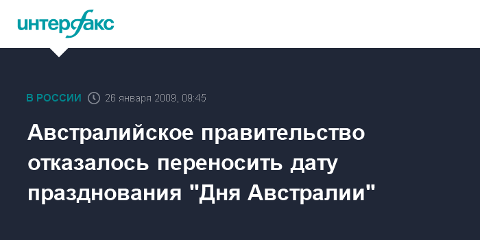 Лондон. 26 января. INTERFAX.RU - Премьер-министр Австралии Кевин Радд отказался перенести дату главного праздника страны - Дня Австралии, - который традиционно отмечается 26 января, сообщает британская телерадиокорпорация BBC.