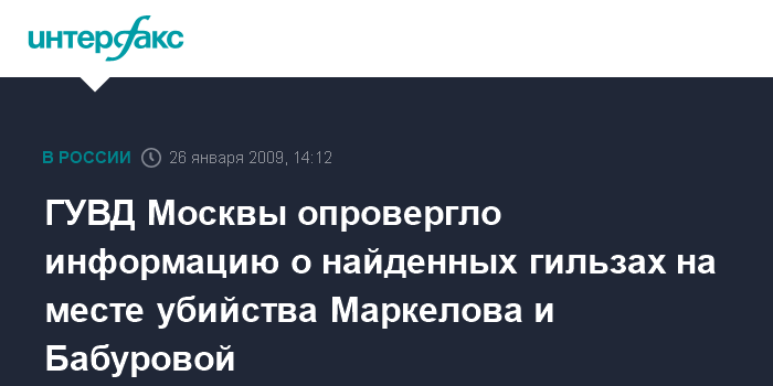 Москва. 26 января. INTERFAX.RU - Информация о том, что на месте убийства адвоката Станислава Маркелова и журналистки Анастасии Бабуровой найдены три гильзы, не соответствует действительности, заявил в понедельник "Интерфаксу" начальник управления информации и общественных связей ГУВД Москвы Виктор Бирюков. При этом он отказался от более подробных комментариев на эту тему.