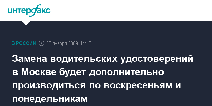 Москва. 26 января. INTERFAX.RU - Столичная ГИБДД сообщает, что с 26 января прием граждан по вопросу замены водительских удостоверений будет дополнительно организован по понедельникам и воскресеньям. "Такое решение принято в целях улучшения обслуживания населения, сокращения очередей в экзаменационных подразделениях ГИБДД столицы", - пояснили "Интерфаксу" в понедельник в УГИБДД Москвы.
