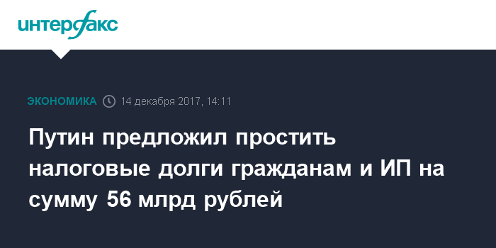 Позже источник "Интерфакса", знакомый с обсуждением, пояснил, о каких задолженностях мог говорить глава государства. Так, по его мнению, в случае с физлицами речь может идти о списании задолженности, возникшей по имущественным налогам до 2015 года, по которой срок взыскания истечет в 2018 году.