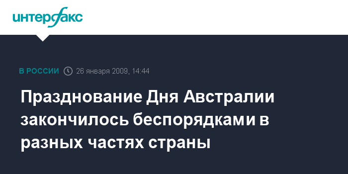Москва. 26 января. INTERFAX.RU - Празднование "Дня Австралии" - главного праздника страны - переросло в понедельник в массовые беспорядки, сопровождаемые расистскими лозунгами и погромами, сообщает австралийская телерадиокорпорация ABC. Как отмечается в сообщении, волнения были зафиксированы в штате Новый Южный Уэльс, а также на всемирно известном курорте Золотой берег (штат Квинсленд) и в Сиднее.