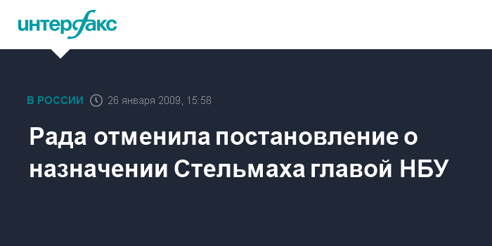 Киев. 26 января. INTERFAX.RU - Верховная Рада в понедельник отменила постановление о назначении Владимира Стельмаха на должность главы Нацбанка Украины от 16 декабря 2004 года.
