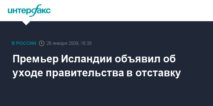 Лондон. 26 января. INTERFAX.RU - Премьер-министр Исландии Гейр Хорде объявил в понедельник об уходе правительства страны в отставку, сообщает BBC.