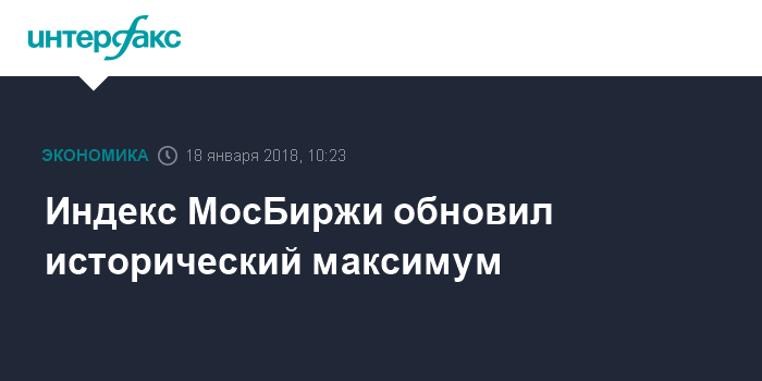 Москва. 18 января. INTERFAX.RU - Индекс МосБиржи, один из основных российских фондовых индикаторов, утром в четверг обновил исторический максимум, превысив предыдущий пик от 3 января 2017 года - 2293,99 пункта - на благоприятном внешнем фоне.