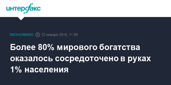 Москва. 22 января. INTERFAX.RU - Около 82% всех богатств, которые появились в мире в 2017 году, находятся в руках 1% населения планеты, следует из исследования благотворительной организации Oxfam.