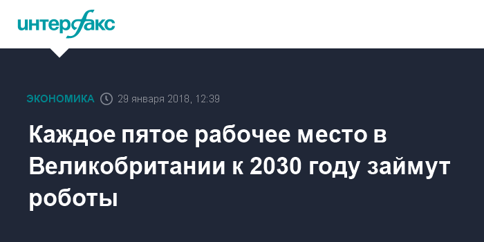 Москва. 29 января. INTERFAX.RU - Каждое пятое рабочее место (21%) в Великобритании к 2030 году будет занято роботами, свидетельствуют данные исследовательского института Centre for Cities. От этих изменений на рынке труда больше всего пострадают жители севера Англии, пишет The Sun.