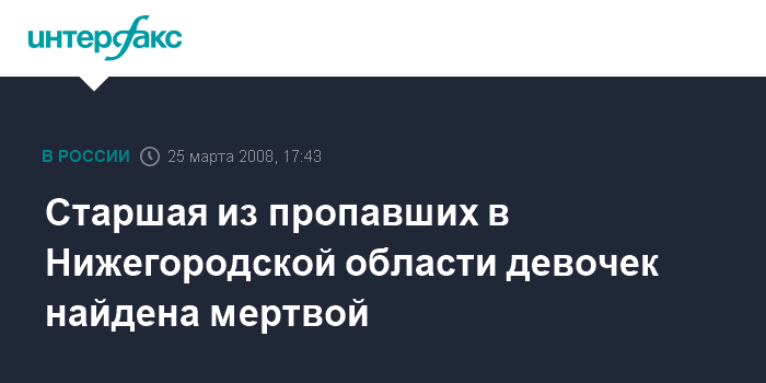 Нижний Новгород. 25 марта. INTERFAX.RU - В Городецком районе Нижегородской области сотрудники милиции обнаружили тело одной из пропавших накануне девочек. Как сообщил агентству "Интерфакс" во вторник источник в ГУВД Нижегородской области, "в ходе поисков на берегу реки Узола была найдена одежда девочек, а затем, в воде было найдено тело Наташи, старшей из девочек".