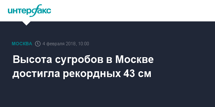 Высота снежного покрова на главной московской метеостанции (ВДНХ) за последние 24 часа увеличилась с 32 до 43 см и достигла рекордного для нынешней зимы значения, отметили в ведомстве. Норма осадков для февраля в Москве составляет 36 мм.