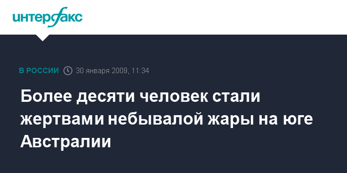 Москва. 30 января. INTERFAX.RU - Небывалая 40-градусная жара, которая держится на юге Австралии уже третий день, стала причиной смерти более 10 человек, сообщает в пятницу австралийская телерадиокоропорация Эй-би-си.