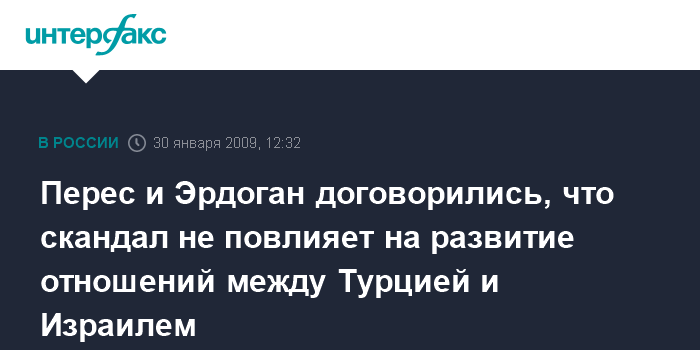 "Я очень сожалею о случившимся, даже между друзьями могут возникать ссоры", - заявил Ш.Перес в беседе с главой турецкого правительства. "Я всегда с большим уважением относился к Турции и к Вам, как к премьер-министру этой страны. Я считаю себя другом Турции и премьера Эрдогана", - подчеркнул президент Израиля.