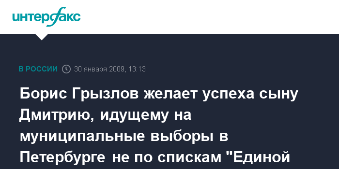 "Я от всей души желаю ему успеха", - сказал "Интерфаксу" в пятницу Б.Грызлов в ответ на вопрос, будет ли он поддерживать сына, зарегистрированного в качестве независимого кандидата на муниципальных выборах в Санкт-Петербурге.