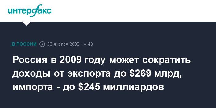 Москва. 30 января. INTERFAX.RU - Россия в 2009 году может сократить доходы от экспорта до $269 млрд, доходы от импорта снизятся до $245 млрд, заявил вице-премьер, министр финансов РФ Алексей Кудрин, выступая на правительственном часе в Госдуме.