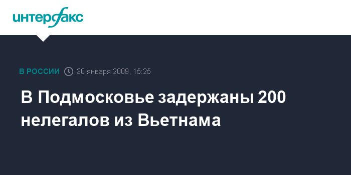 Москва. 30 января. INTERFAX.RU - В Подмосковье задержаны 200 граждан Вьетнама, находившихся на территории России нелегально, сообщили "Интерфаксу" в пятницу в пресс-службе УФМС Московской области.