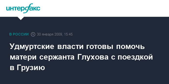 Москва. 30 января. INTERFAX.RU - Власти Удмуртии готовы оказать матери сержанта Александра Глухова, оказавшегося в Грузии, Галине Глуховой поддержку для организации ее поездки к сыну в Тбилиси.