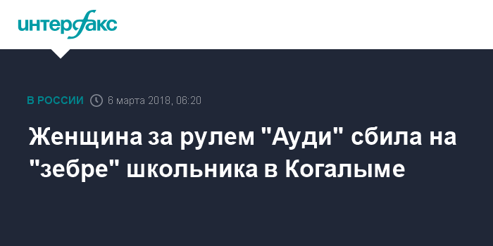 По данным ведомства, в понедельник в 10:50 мск на улице Мира в Когалыме 46-летняя женщина за рулем "Ауди" сбила школьника, переходившего дорогу по нерегулируемому пешеходному переходу.