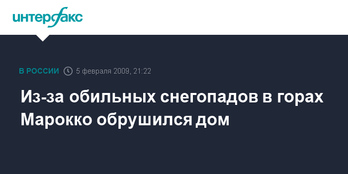 Йоханнесбург. 5 февраля. INTERFAX.RU - Не менее шести человек погибли в четверг в результате обрушения дома в горах Атлас в Марокко, сообщает южноафриканский информационный канал News-24". По его данным, обрушение дома произошло из-за обильных снегопадов.
