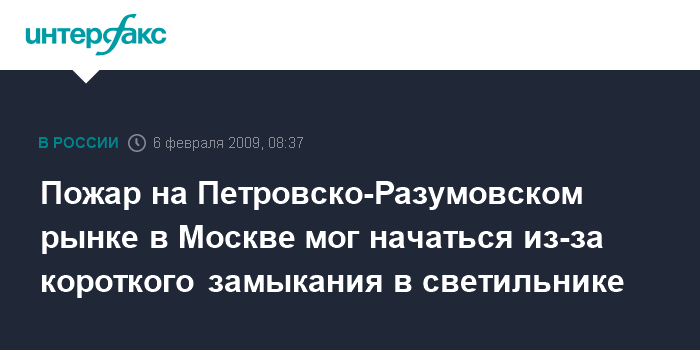 Москва. 6 февраля. INTERFAX.RU - Крупный пожар на Петровско-Разумовском рынке, произошедший накануне на севере Москвы, по предварительным данным, был вызван коротким замыканием, сообщил "Интерфаксу" источник в правоохранительных органах в пятницу.