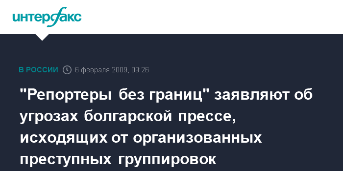 Москва. 6 февраля. INTERFAX.RU - Свободе печати в Болгарии сильно угрожает организованная преступность, особенно от нее страдают журналисты, работающие в жанре расследований, говорится в коммюнике, распространенном в Париже в четверг неправительственной организацией "Репортеры без границ" (РБГ).