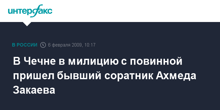 Москва. 6 февраля. INTERFAX.RU - В Чечне добровольно явился в милицию бывший подчиненный Ахмеда Закаева, сообщили "Интерфаксу" в пресс-службе МВД по ЧР.