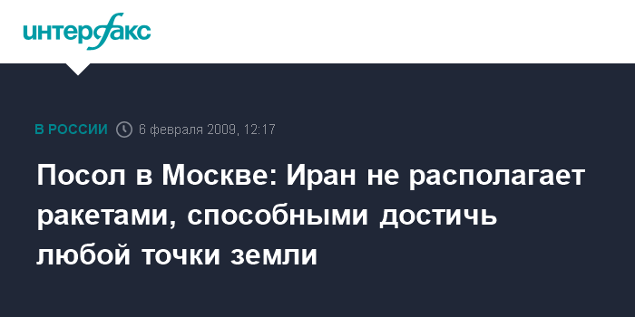 Москва. 6 февраля. INTERFAX.RU - Иран опровергает информацию о том, что располагает ракетами, способными достичь любой точки земли, заявил иранский посол в Москве Махмуд Реза Саджади.
