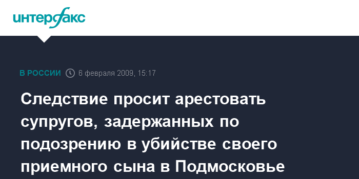 "Сегодня следственными органами СКП РФ по Московской области в Люберецкий городской суд направлено ходатайство об избрании в отношении семейной пары, подозреваемой в убийстве своего приемного сына, меры пресечения в виде заключения под стражу", - сообщил "Интерфаксу" официальный представитель СКП РФ Владимир Маркин в пятницу.