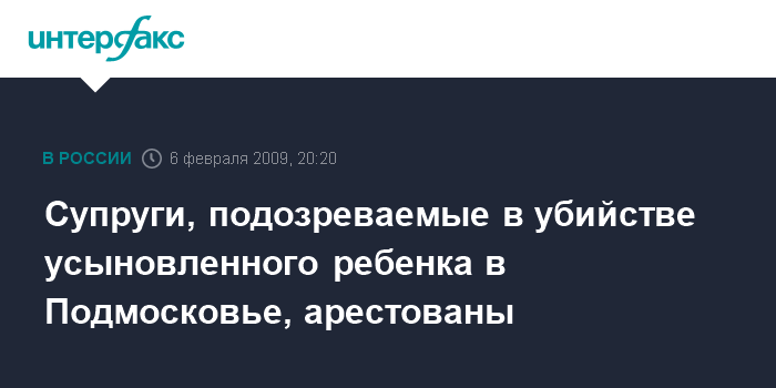 Москва. 6 февраля. INTERFAX.RU - Суд выдал санкцию на арест супружеской пары, задержанной по подозрению в убийстве усыновленного трехлетнего ребенка в Подмосковье.