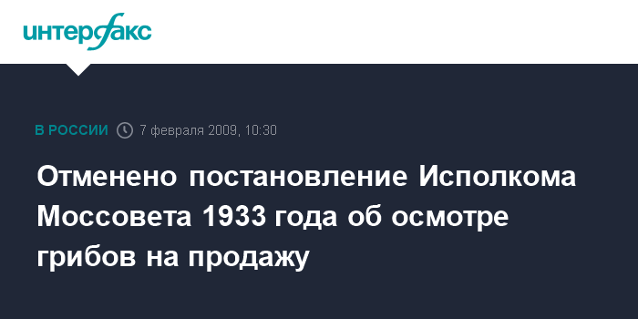Москва. 7 февраля. INTERFAX.RU - Постановлением правительства Москвы, подписанном мэром города Юрием Лужковым, отменен ряд устаревших нормативных документов, в том числе постановление Исполнительного комитета Моссовета от 1933 года "О санитарном осмотре грибов, поступающих в продажу".