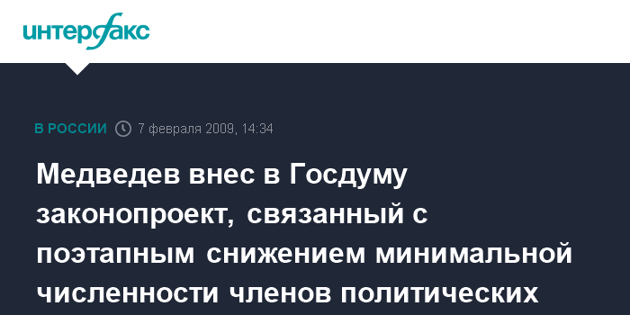 Москва. 7 февраля. INTERFAX.RU - Президент России Дмитрий Медведев в соответствии с пунктом "г" статьи 84 Конституции РФ направил в Государственную Думу проект федерального закона "О внесении изменений в Федеральный закон "О политических партиях" в связи с поэтапным снижением минимальной численности членов политических партий". Об этом сообщила в субботу пресс-служба главы государства.