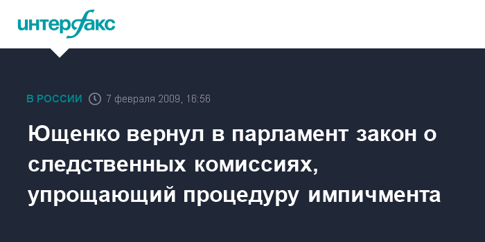 Москва. 7 февраля. INTERFAX.RU - Президент Украины Виктор Ющенко вернул в Верховную Раду со своими предложениям закон о временных следственных комиссиях, специальной временной следственной комиссии и временных специальных комиссиях, предусматривающий упрощение процедуры импичмента.