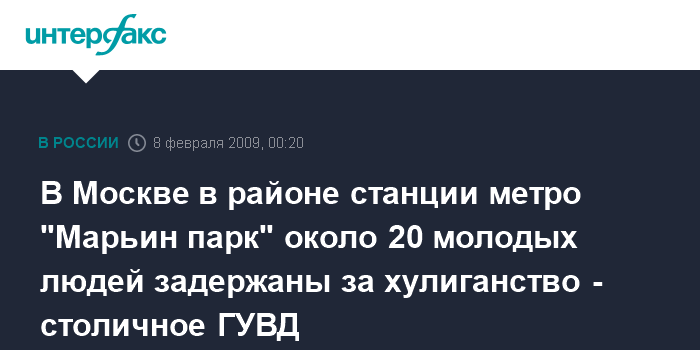 По его словам, в районе станции метро "Марьин парк" в Мячковском саду состоялся концерт, после этого концерта на выходе из сада группа молодых людей начала хулиганить и сотрудники милиции были вынуждены вмешаться. За нарушение общественного порядка были задержаны около 20 человек, всех их доставили в районное УВД после чего отпустили.