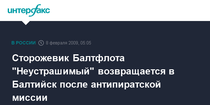 Калининград. 8 февраля. ИНТЕРФАКС-АВН - Сторожевой корабль "Hеустрашимый" вернется на главную базу Балтийского флота город Балтийск в воскресенье, сообщили "Интерфаксу" в пресс-службе БФ.