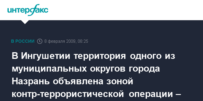 Назрань. 8 февраля. ИНТЕРФАКС-ЮГ - Территория муниципального округа Насэр-Корт города Назрань объявлена зоной проведения контр-террористической операции, сообщили агентству "Интерфакс-Юг" в пресс-службе УФСБ по Ингушетиии.
