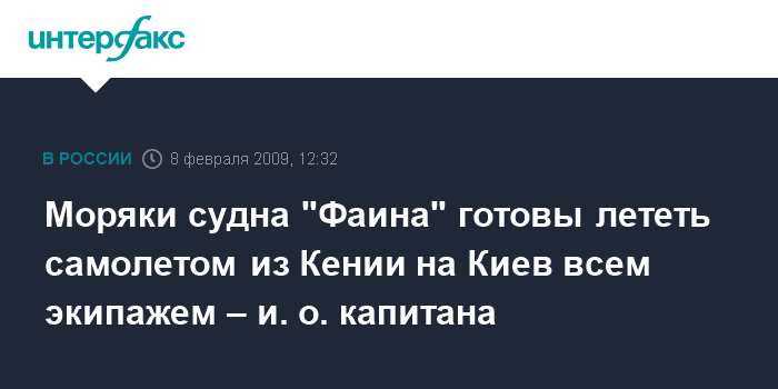 Киев. 8 февраля. INTERFAX.RU - Моряки освобожденного пиратами судна "Фаина" - граждане Украины, России и Латвии - выразили готовность лететь самолетом из Кении на Киев всем экипажем, сообщил исполняющий обязанности капитана судна Виктор Никольский в телефоном разговоре с уполномоченным по правам человека Ниной Карпачевой.